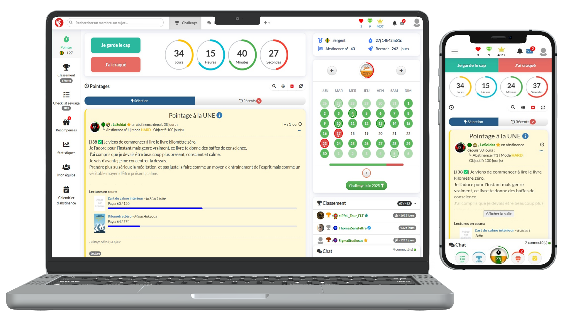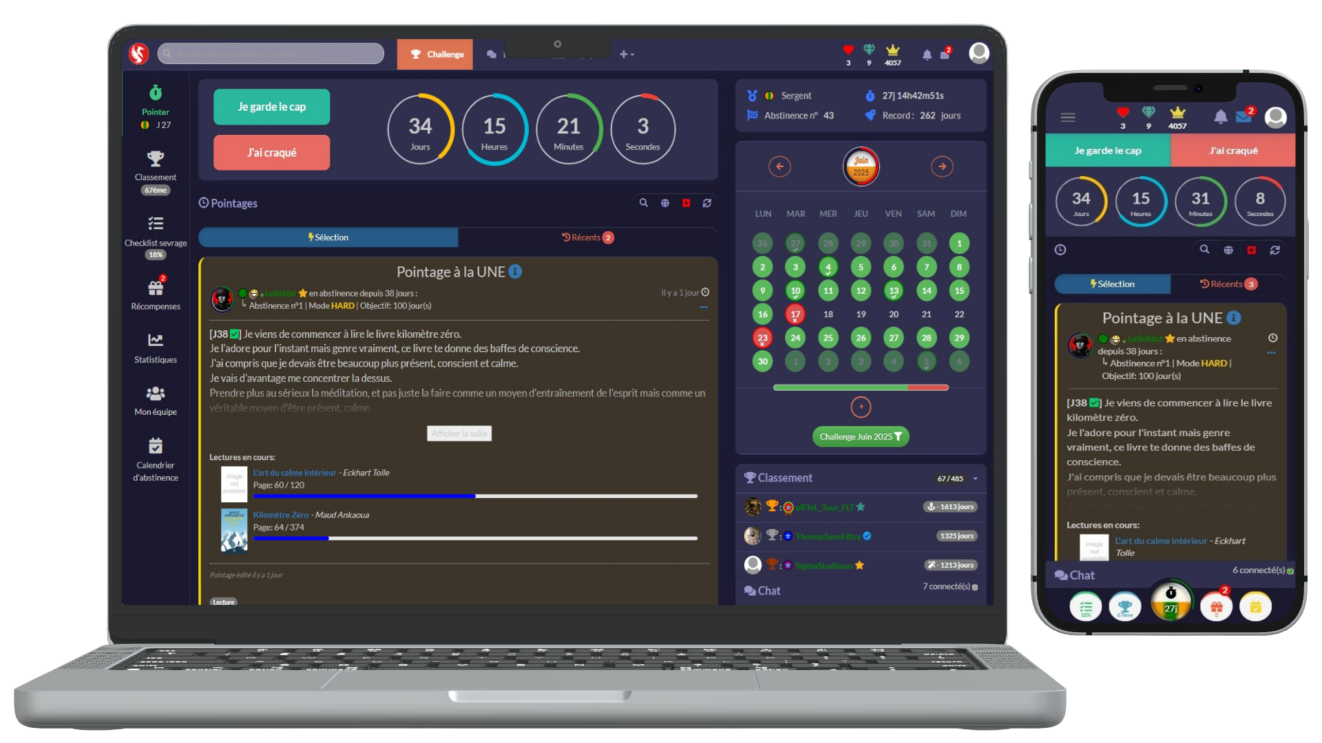 Le compteur de jours d'abstinence offre une mesure tangible de votre progrès, vous motivant et facilitant le partage de votre réussite avec la communauté.