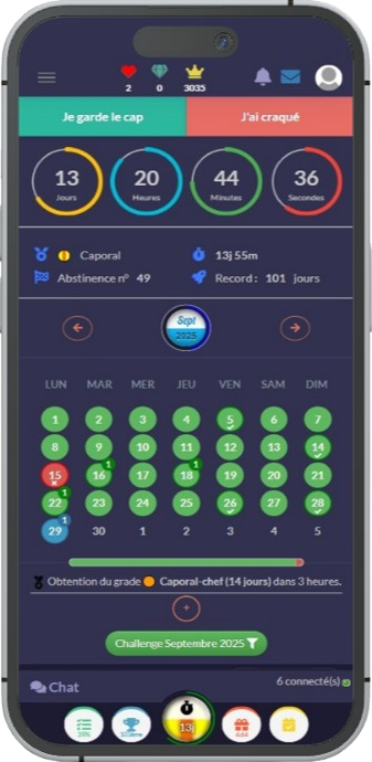 Plus votre compteur de jours d'abstinence augmente, meilleur sera votre grade et votre positionnement dans le classement.